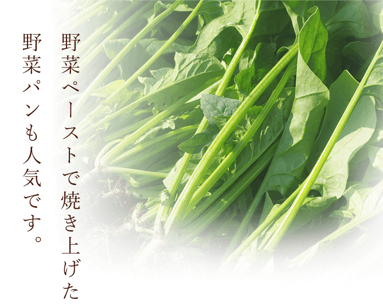 「MUGINOKI」では、さまざまな素材を使った多彩なオリジナルパンをお届けしています。中でも、野菜を練り込んだり盛り込んだパンはヘルシーな美味しさが評判。ちょっと野菜が苦手なお子様にも人気です。